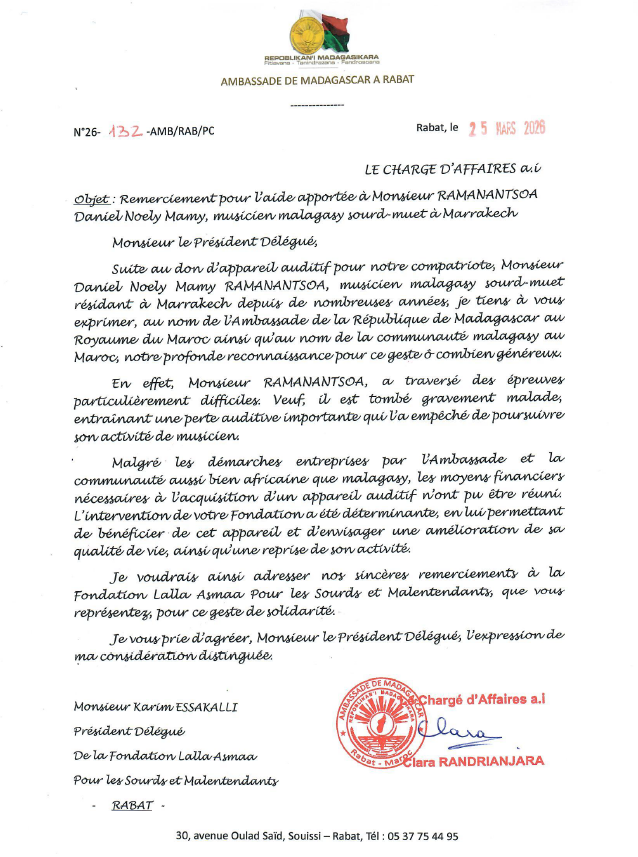 L’Ambassade de Madagascar au Maroc, représentation diplomatique du pays d’origine de Noël Mamy, a aussi officiellement exprimé sa profonde gratitude, saluant ce geste d’une grande générosité, qui a permis d’améliorer significativement la qualité de vie du bénéficiaire, et d’envisager une reprise de son activité de musicien. Car, en plus de l’appareil auditif, ladite Fondation a permis à Noël Mamy de bénéficier aussi d’une prise en charge complète pour ses séances de rééducation chez un orthophoniste.