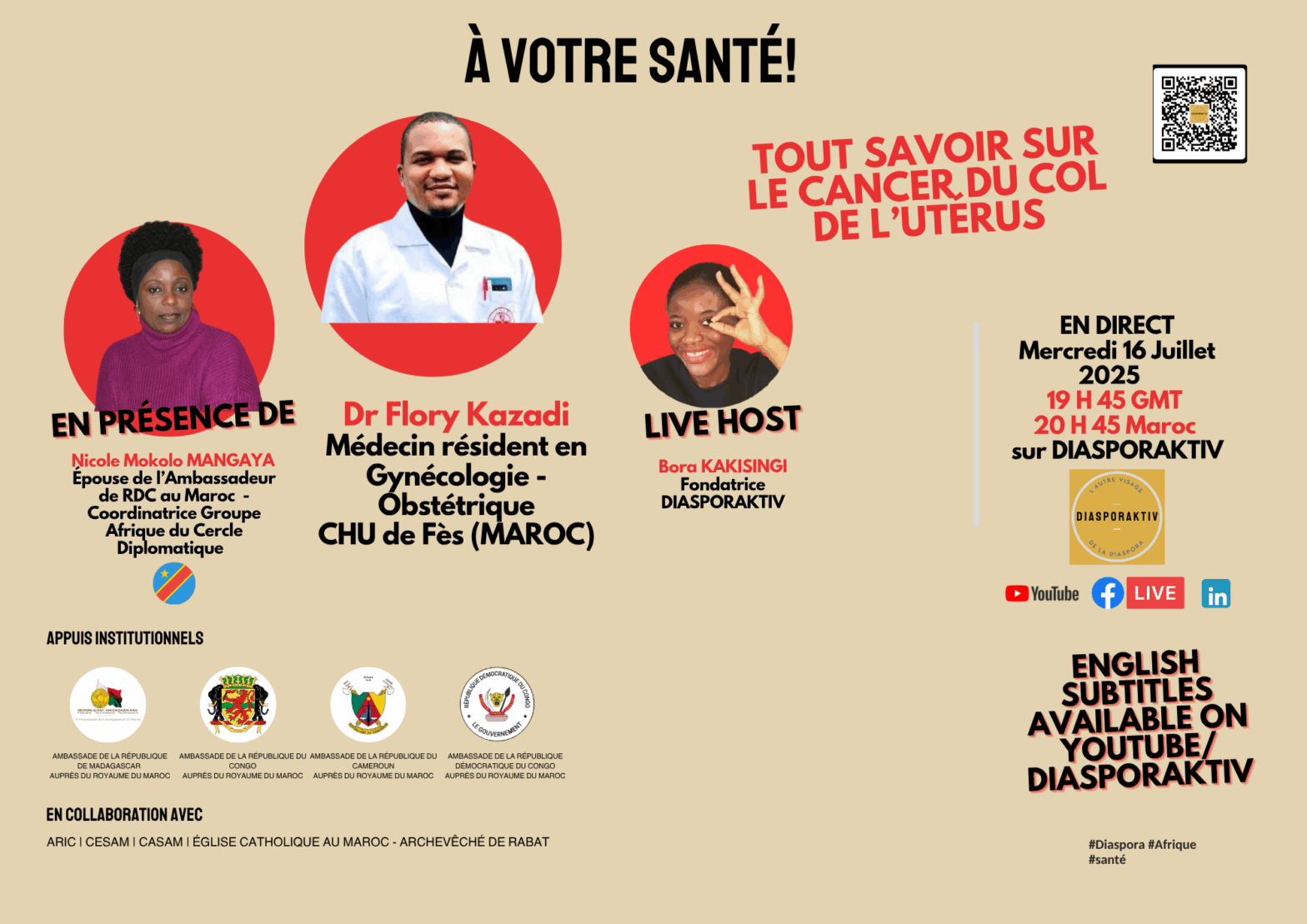 Le Groupe des Épouses des Ambassadeurs Africains au Maroc (GEAAM) rejoint les émissions “À VOTRE SANTÉ” de DiasporaKtiv, en tant qu’appui institutionnel! Créé conformément aux dispositions du Dahir de 1958 sur le droit d’association au Maroc le 16 Septembre 2025, le GEAAM regroupe les épouses des ambassadeurs et/ou chefs de missions diplomatiques africains accrédités au… Poursuivre la lecture Le Groupe des Épouses des Ambassadeurs Africains au Maroc, appui institutionnel des émissions “À VOTRE SANTÉ!”