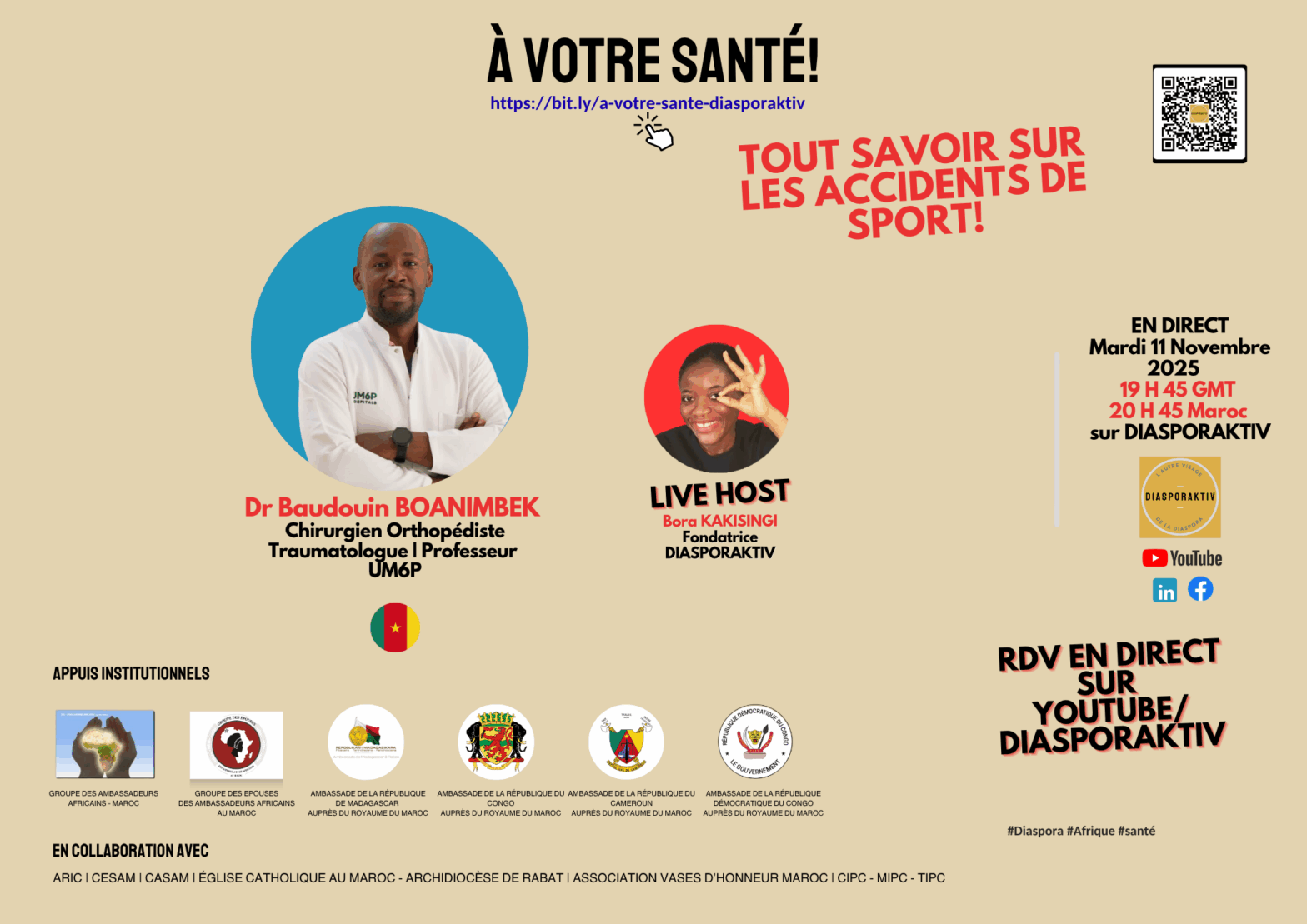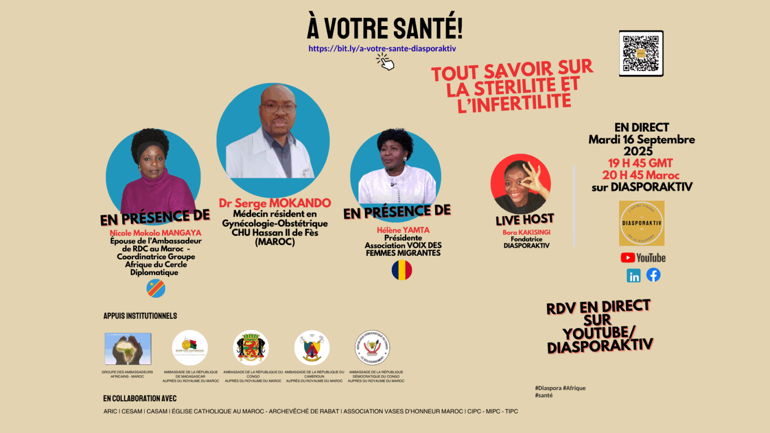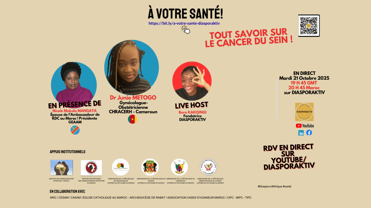 Le Groupe des Épouses des Ambassadeurs Africains au Maroc (GEAAM) rejoint les émissions “À VOTRE SANTÉ” de DiasporaKtiv, en tant qu’appui institutionnel! Créé conformément aux dispositions du Dahir de 1958 sur le droit d’association au Maroc le 16 Septembre 2025, le GEAAM regroupe les épouses des ambassadeurs et/ou chefs de missions diplomatiques africains accrédités au… Poursuivre la lecture Le Groupe des Épouses des Ambassadeurs Africains au Maroc, appui institutionnel des émissions “À VOTRE SANTÉ!”